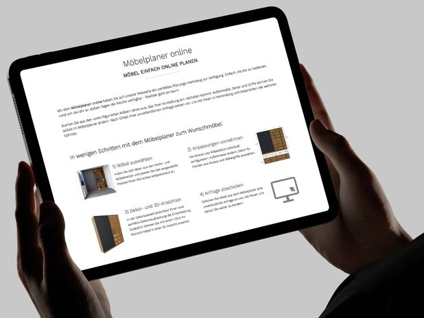 Konfigurieren Sie einfach und intuitiv Außenmaße, Dekor und Griffe und sehen Sie sich Ihr Wunschmöbel in der 3D-Ansicht an.