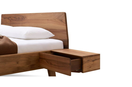 Nachtkästchen für das Massivholzbett ELBA EL40 mit Schublade inklusive Auflageleisten am Bett befestigt.