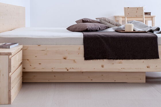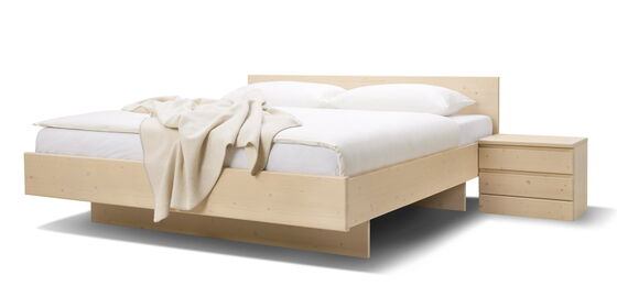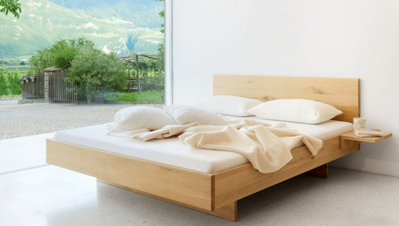 Das bestechend schnörkellose Massivholzbett lädt zum Spiel mit Oberflächen und Materialien ein. Für eine geradlinige Optik sind die Griffe in das Naturholz gefräst.