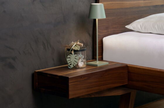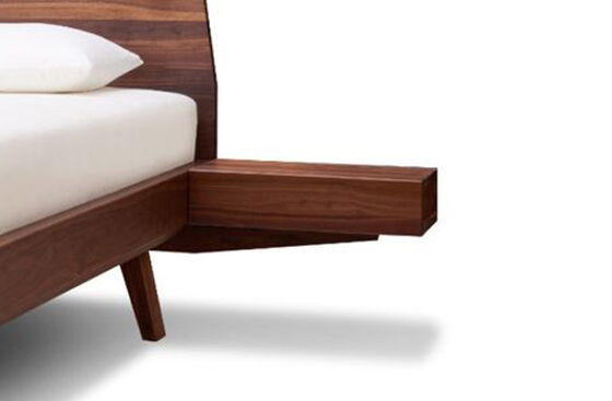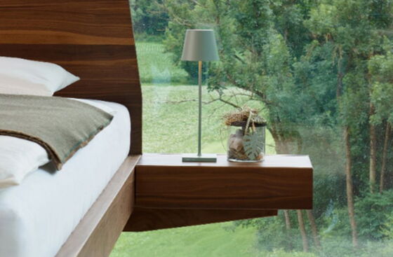 Nachtkästchen für das Massivholzbett ELBA EL40 mit Klappe inklusive Auflageleisten am Bett befestigt.