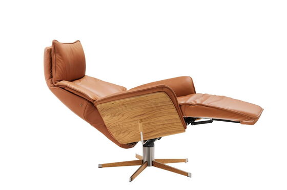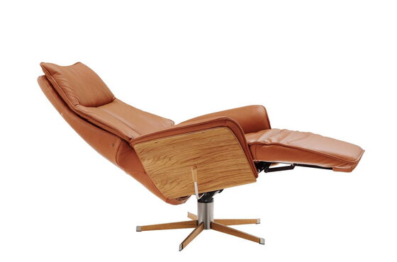 Relaxsessel mit eleganter Sperrholzschale, verstellbarer Rückenlehne, Fußstütze und Kopfstütze.