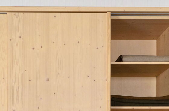 Massivholzschrank mit rahmenlosen Schiebetüren und Griffleisten. Innenleben nach Wunsch konfigurierbar.